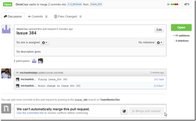 The two commits of the 3.4_Release branch are one from the Issue_459 branch and one from the pull request merge (note above how we could now do a Pull request from this 3.4_Release branch into the master branch):