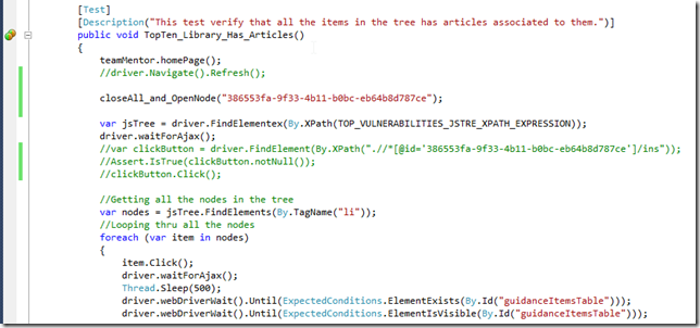 var testBase = (TMTestBase<ChromeDriver>)unitTest; var driver = (ChromeDriver)testBase.driver; testBase.teamMentor.homePage(); //driver.Navigate().Refresh(); var privateField = testBase.field<string>("OWASP_JSTRE_XPATH_EXPRESSION"); var clickButton = driver.FindElement(By.XPath(".//*[@id='30b034e7-f3a2-4a81-acbc-e357129711ff']/ins")); Action<string> closeAll_and_OpenNode = (nodeId)=>{ driver.executeJavaScript("TM.Gui.LibraryTree.jsTree.close_all();"); 200.wait(); driver.executeJavaScript("TM.Gui.LibraryTree.openNode('#{0}')".format(nodeId)); }; closeAll_and_OpenNode("30b034e7-f3a2-4a81-acbc-e357129711ff"); clickButton.Click(); var jsTree = driver.FindElementex(By.XPath(privateField)); var nodes = jsTree.FindElements(By.TagName("li")); Assert.IsTrue(nodes.Count == 10, "There should be 10 Items int this library"); Assert.IsTrue(nodes.Any(x => x.Text.ToString().Trim() == "A01: Injection")); Assert.IsTrue(nodes.Any(x => x.Text.ToString().Trim() == "A02: Cross-Site Scripting (XSS)")); Assert.IsTrue(nodes.Any(x => x.Text.ToString().Trim() == "A03: Broken Authentication and Session Management")); Assert.IsTrue(nodes.Any(x => x.Text.ToString().Trim() == "A04: Insecure Direct Object References")); Assert.IsTrue(nodes.Any(x => x.Text.ToString().Trim() == "A05: Cross-Site Request Forgery (CSRF)")); Assert.IsTrue(nodes.Any(x => x.Text.ToString().Trim() == "A06: Security Misconfiguration")); Assert.IsTrue(nodes.Any(x => x.Text.ToString().Trim() == "A07: Insecure Cryptographic Storage")); Assert.IsTrue(nodes.Any(x => x.Text.ToString().Trim() == "A08: Failure to Restrict URL Access")); Assert.IsTrue(nodes.Any(x => x.Text.ToString().Trim() == "A09: Insufficient Transport Layer Protection")); Assert.IsTrue(nodes.Any(x => x.Text.ToString().Trim() == "A10: Unvalidated Redirects and Forwards")); return "All Asserts where true"; //using NUnit.Framework //O2Ref:NUnit.Framework.dll //using OpenQA.Selenium //using OpenQA.Selenium.Chrome //using TeamMentor.UnitTests.Automation //O2Ref:TeamMentor.UnitTests.Automation.DLL //O2Ref:WebDriver.dll //O2Ref:Microsoft.CSharp.dll //O2Tag_SetInvocationParametersToDynamic