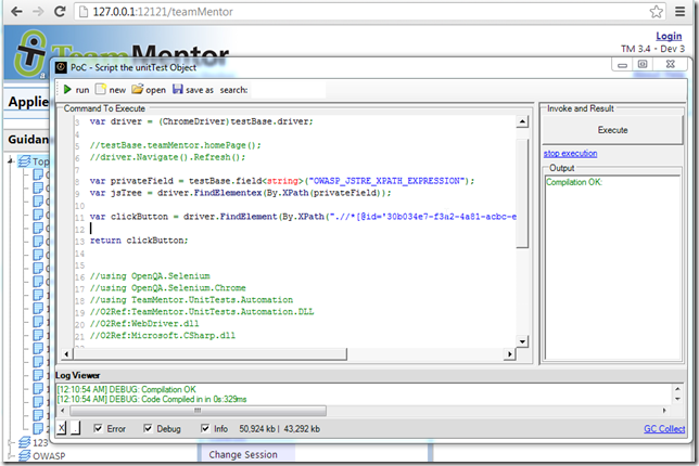 var testBase = (TMTestBase<ChromeDriver>)unitTest; var driver = (ChromeDriver)testBase.driver; //testBase.teamMentor.homePage(); //driver.Navigate().Refresh(); var privateField = testBase.field<string>("OWASP_JSTRE_XPATH_EXPRESSION"); var jsTree = driver.FindElementex(By.XPath(privateField)); var clickButton = driver.FindElement(By.XPath(".//*[@id='30b034e7-f3a2-4a81-acbc-e357129711ff']/ins")); driver.executeJavaScript("alert('hello from C#' )"); clickButton.Click(); return clickButton; //using OpenQA.Selenium //using OpenQA.Selenium.Chrome //using TeamMentor.UnitTests.Automation //O2Ref:TeamMentor.UnitTests.Automation.DLL //O2Ref:WebDriver.dll //O2Ref:Microsoft.CSharp.dll //O2Tag_SetInvocationParametersToDynamic