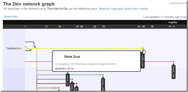 The TeamMentor/Dev graph also shows this workflow in action (note that If I had deleted branches after the pull request, we wouldn’t see the tags in this network graph)